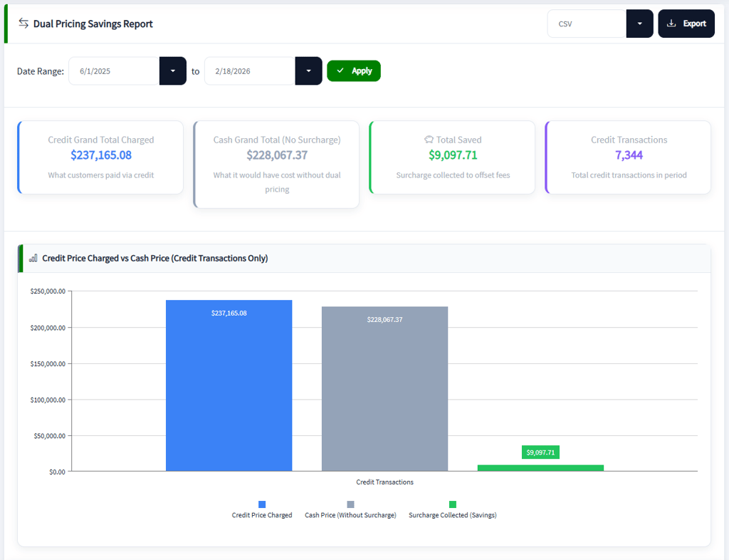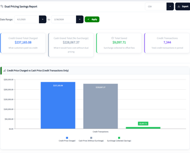 Syncrostore’s Dual-Pricing Savings Report shows you exactly how much your store offsets processing costs over any custom date range.
